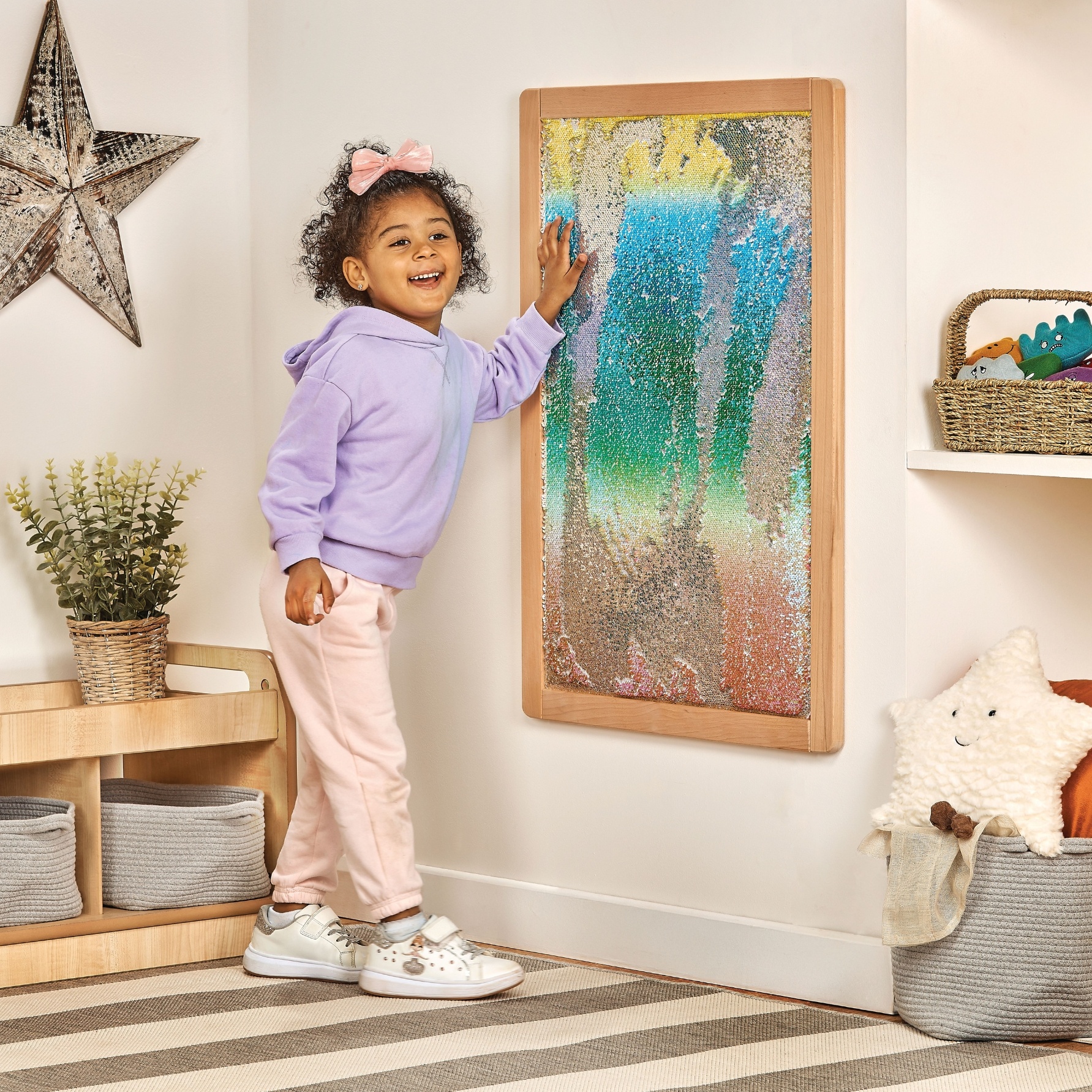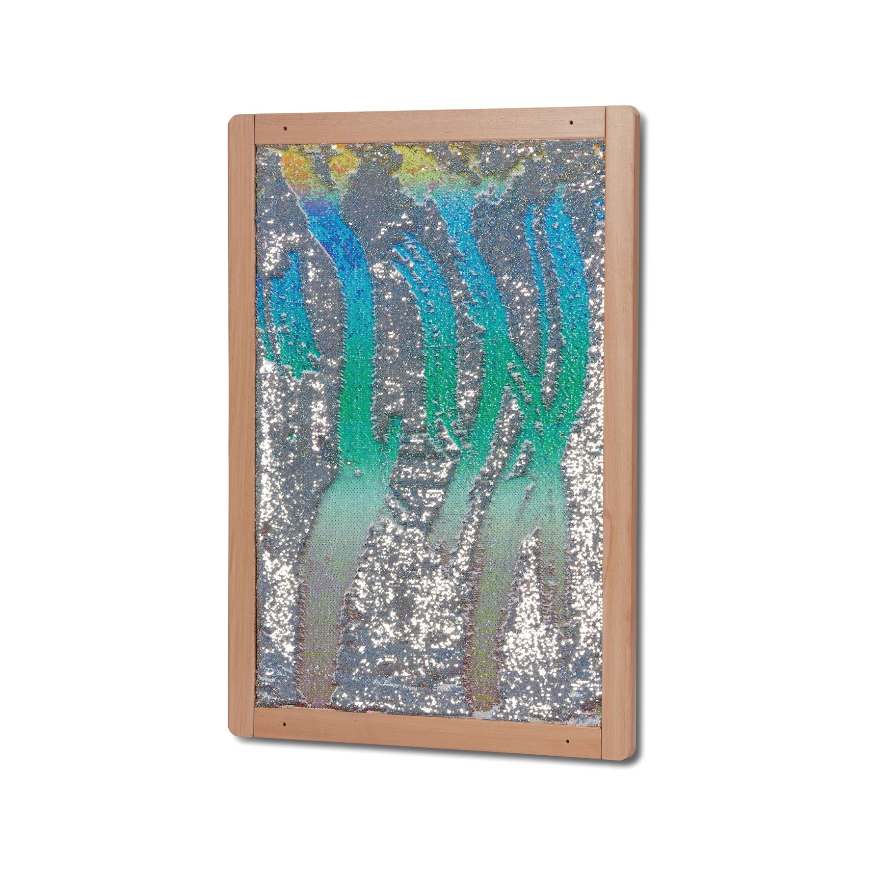 Het paneel bevat een paillettenstof die van kleur verandert wanneer er in verschillende richtingen wordt bewogen. Een magische ontdekking voor jonge kinderen en een mooie aanvulling in je groepsruimte.