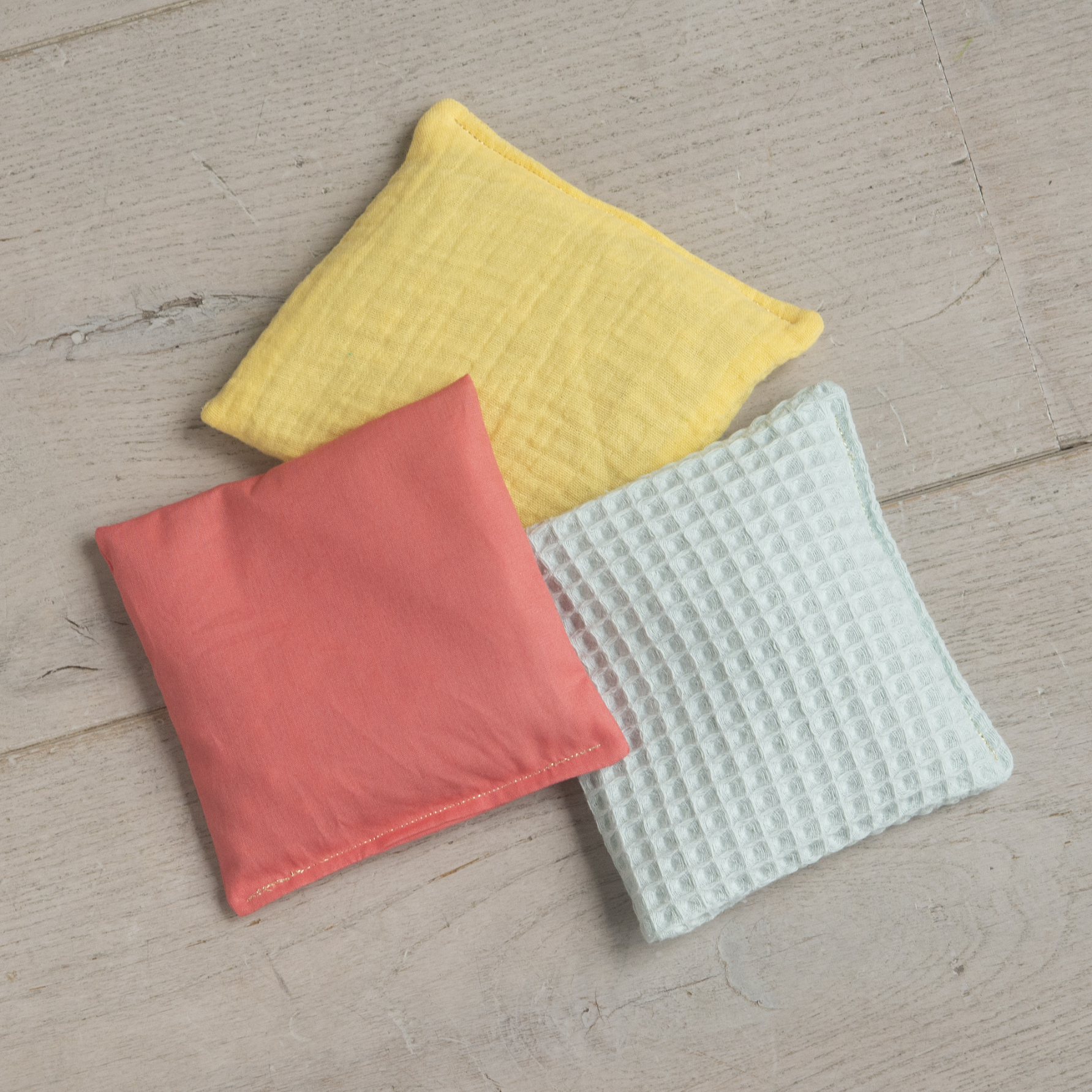 De sensorische pittenzakjes zijn gevuld met natuurlijke materialen die gewassen kunnen worden met de hand. Leg ze in een sopje, laat kort even weken. Wrijf ze stof schoon en spoel ze goed uit. Leg liggend te drogen.