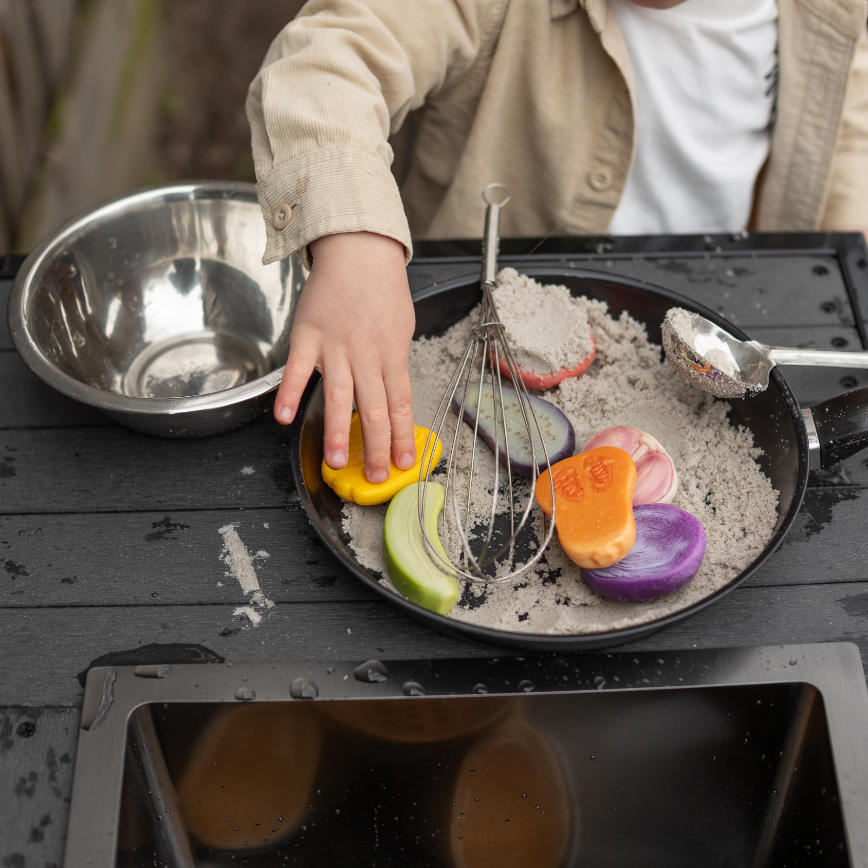 Deze speelstenen zijn geschikt voor zowel binnen- als buitenspel. In de buitenruimte, bijvoorbeeld in een modderkeuken of zandtafel, worden kinderen extra geprikkeld door natuurlijke elementen zoals zand, water en modder. Dit zorgt voor rijk en zintuiglijk spel waarin kinderen volop kunnen ontdekken en experimenteren.