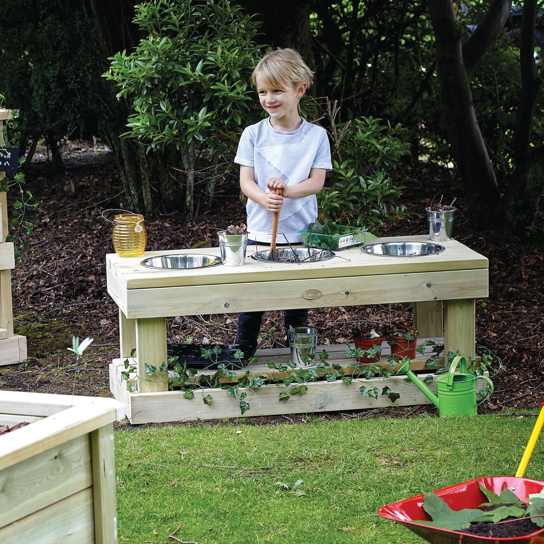 Laat kinderen bij de kinderopvang & onderwijs spelenderwijs ontdekken in de natuur. Deze speeltafel is een aanvulling voor je buitenruimte. De speeltafel bevat 3 zinken schalen die verwijderbaar zijn. De speeltafel bevat een lage opbergplank om materiaal op te bergen.
