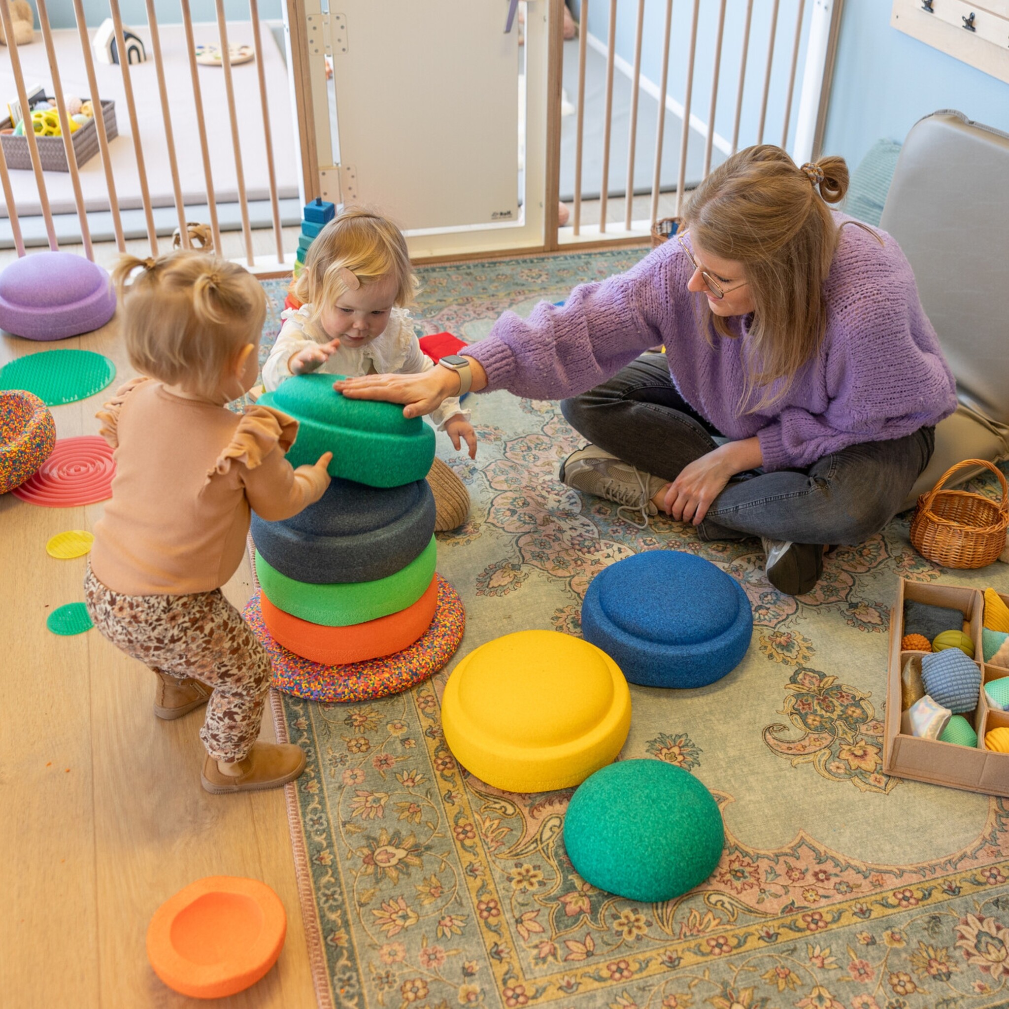 De complete stapelstenen set is een echte aanwinst op de opvang voor alle leeftijden. Super stevig en robuust waardoor je erop kunt springen of balanceren, een pad van stapstenen kunt maken of een stapeltje om op te zitten. En omgedraaid kan er heerlijk in gewiebeld worden of allerlei Loose Parts materialen in worden gesorteerd of bewaard. Ermee bouwen kan natuurlijk ook, dan kan het van alles zijn. Velen zijn fan kunnen ze al niet meer wegdenken op hun groep. Dankzij het lichtgewicht materiaal kunnen kinderen al vanaf jonge leeftijd veilig spelen en bouwen met de stapelstenen.