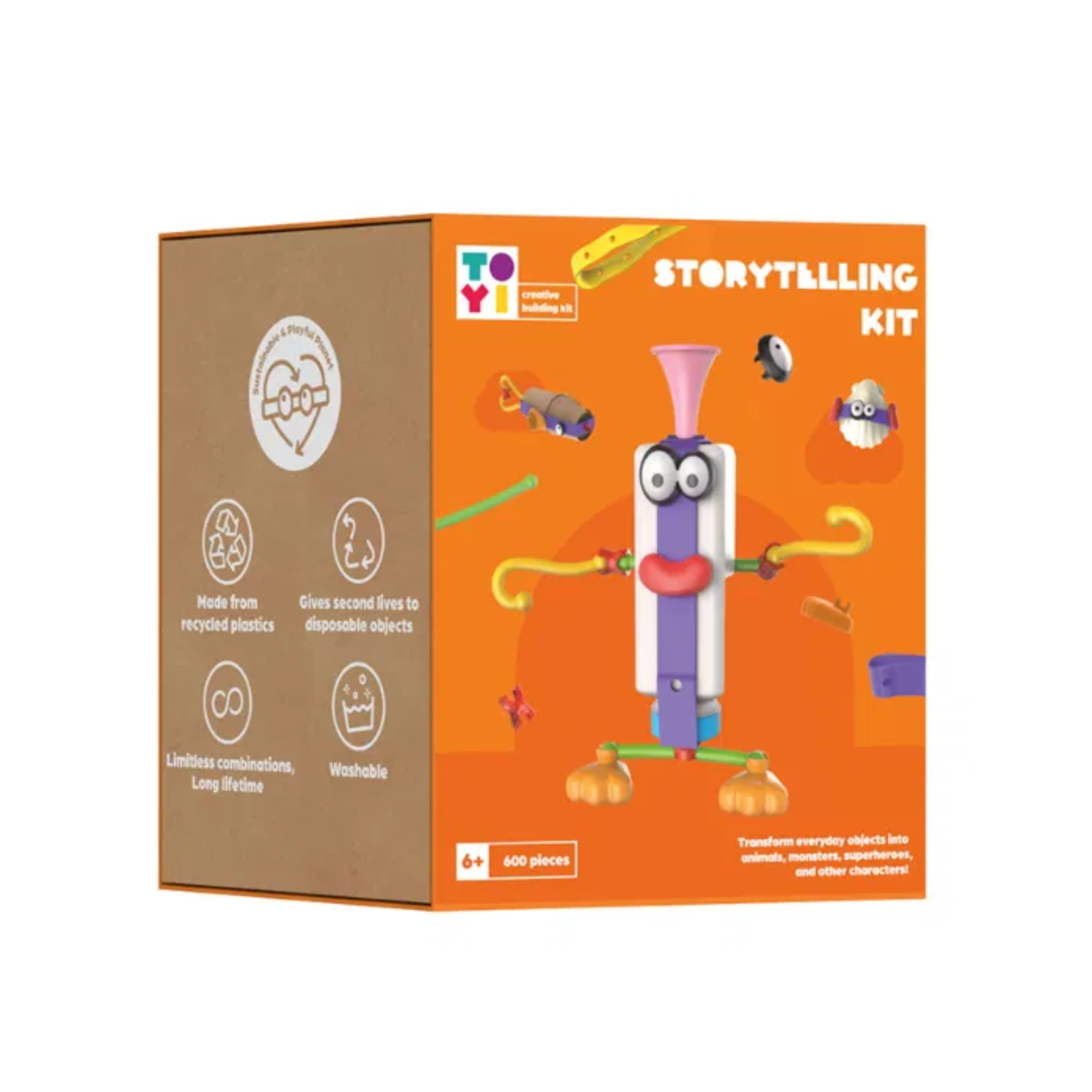 Ontdek de eindeloze mogelijkheden met de Storytelling Event Kit. Deze kit moedigt kinderen aan om creatief te zijn met kosteloze materialen zoals doosjes, flessen, karton, en papieren rolletjes, samen met de in de set geleverde loose parts items. Kinderen kunnen hun eigen unieke attracties, mechanische draai-onderdelen en nog veel meer creëren.