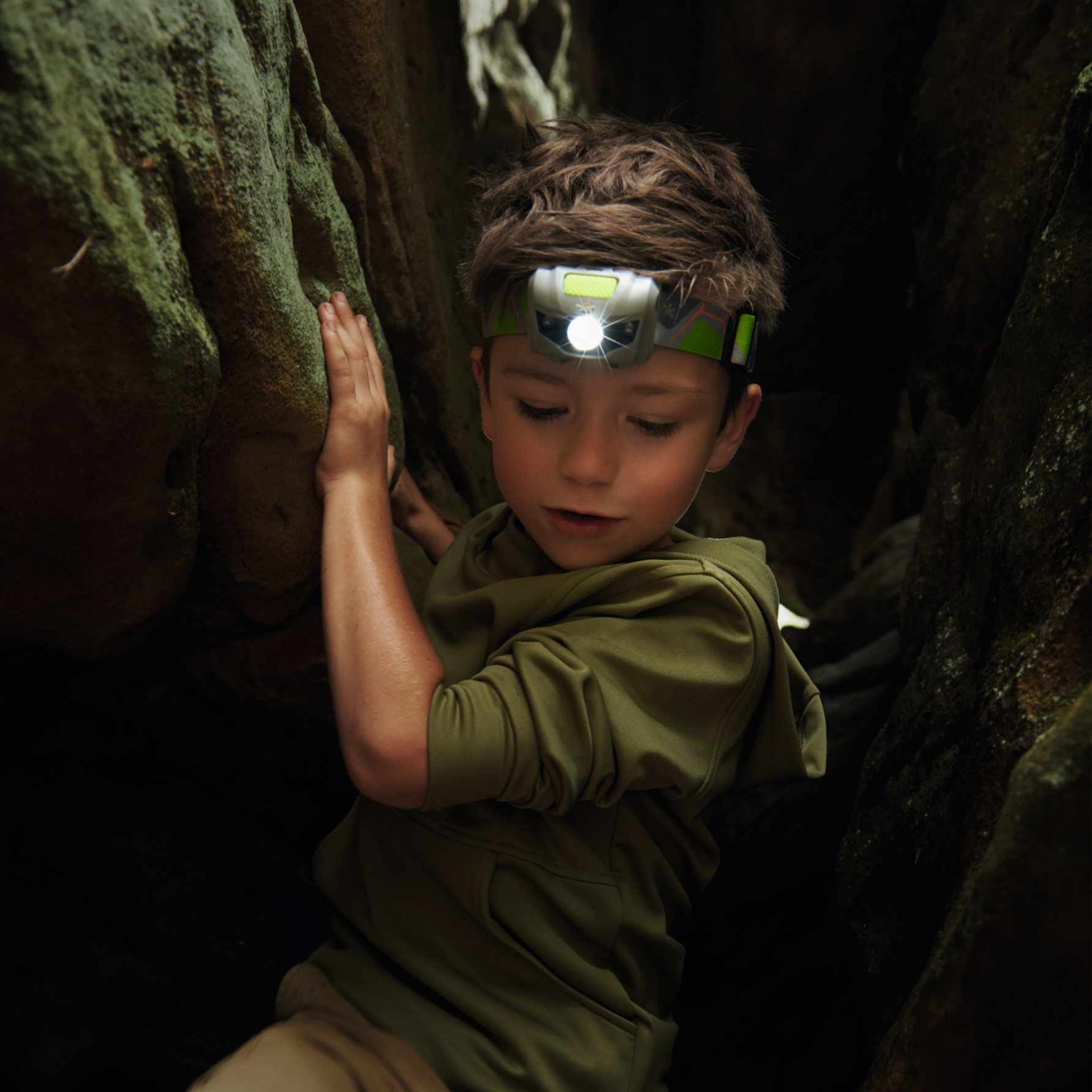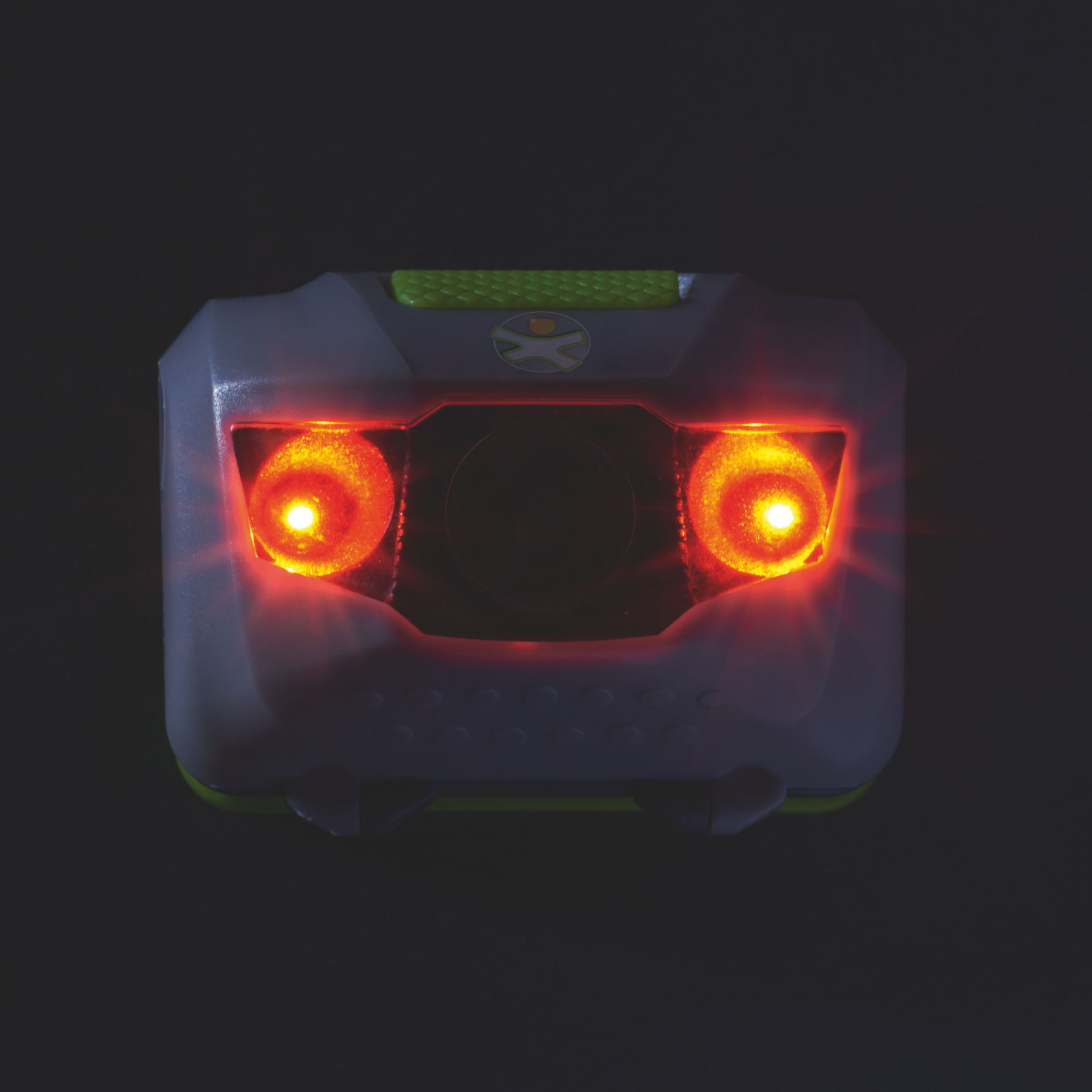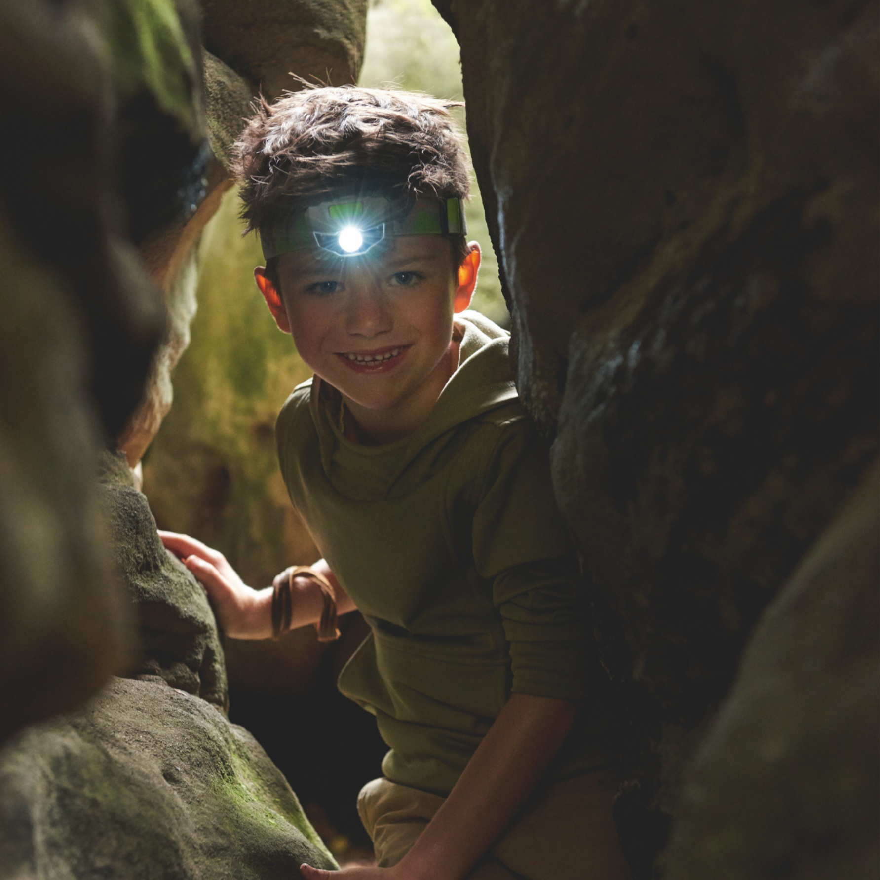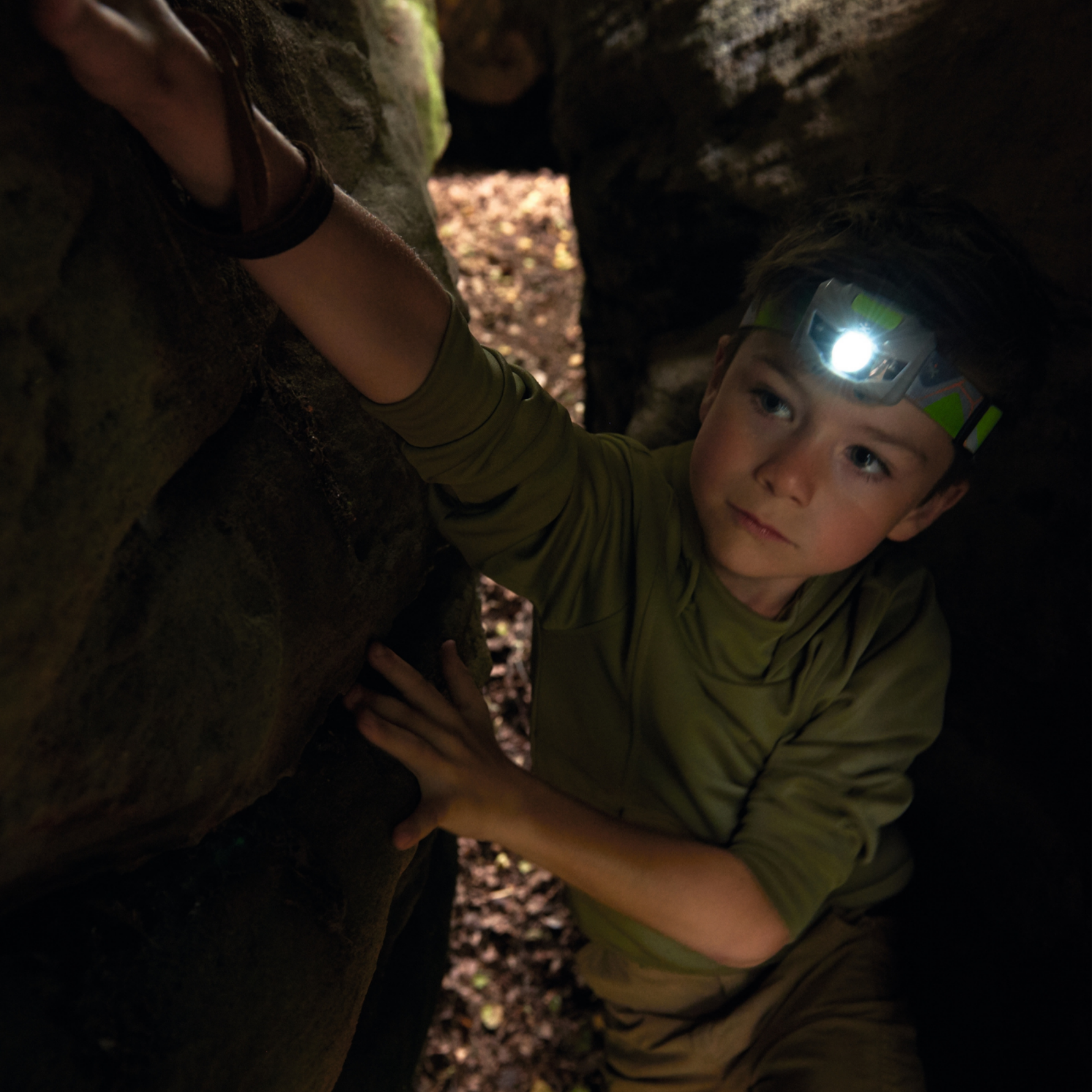 De Terra Kids hoofdlamp van HABA is een stoere en praktische hoofdlamp speciaal voor jonge buitenavonturiers. Met verstelbare elastische band blijft de lamp comfortabel en goed op het hoofd zitten. De lamp heeft zowel witte als rode LED-lichtopties en twee lichtsterktes waardoor kinderen altijd goed zicht hebben in het donker en zichtbaar blijven voor anderen. De hoek van de lamp is verstelbaar en het ontwerp is spatwaterdicht, zodat hij ook bij regenachtig weer buiten gebruikt kan worden. De hoofdlamp werkt op batterijen (3× AAA, niet inbegrepen) en is gemaakt van stevig kunststof met polyester en nylon banden, ideaal voor avontuurlijke buitenactiviteiten in de BSO.