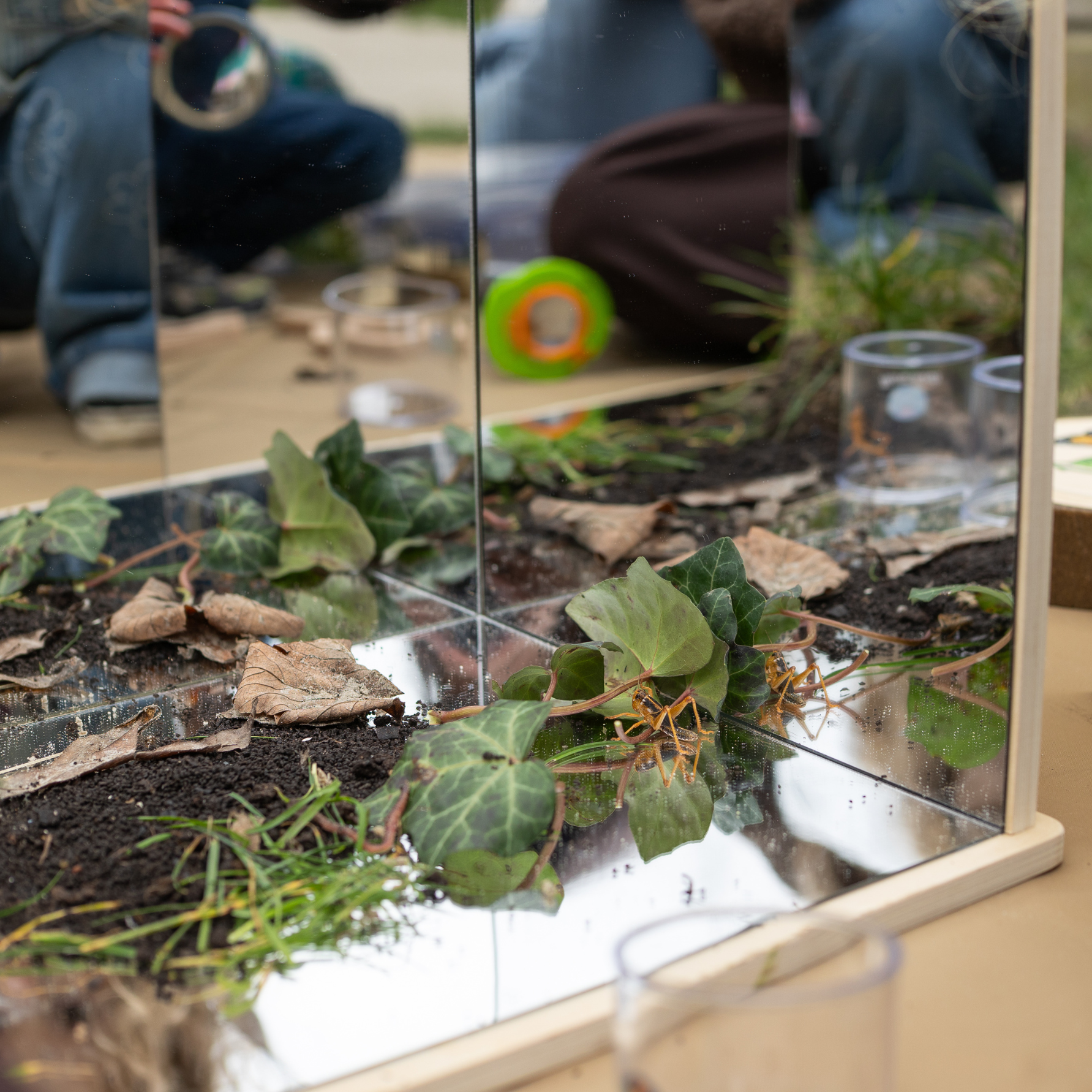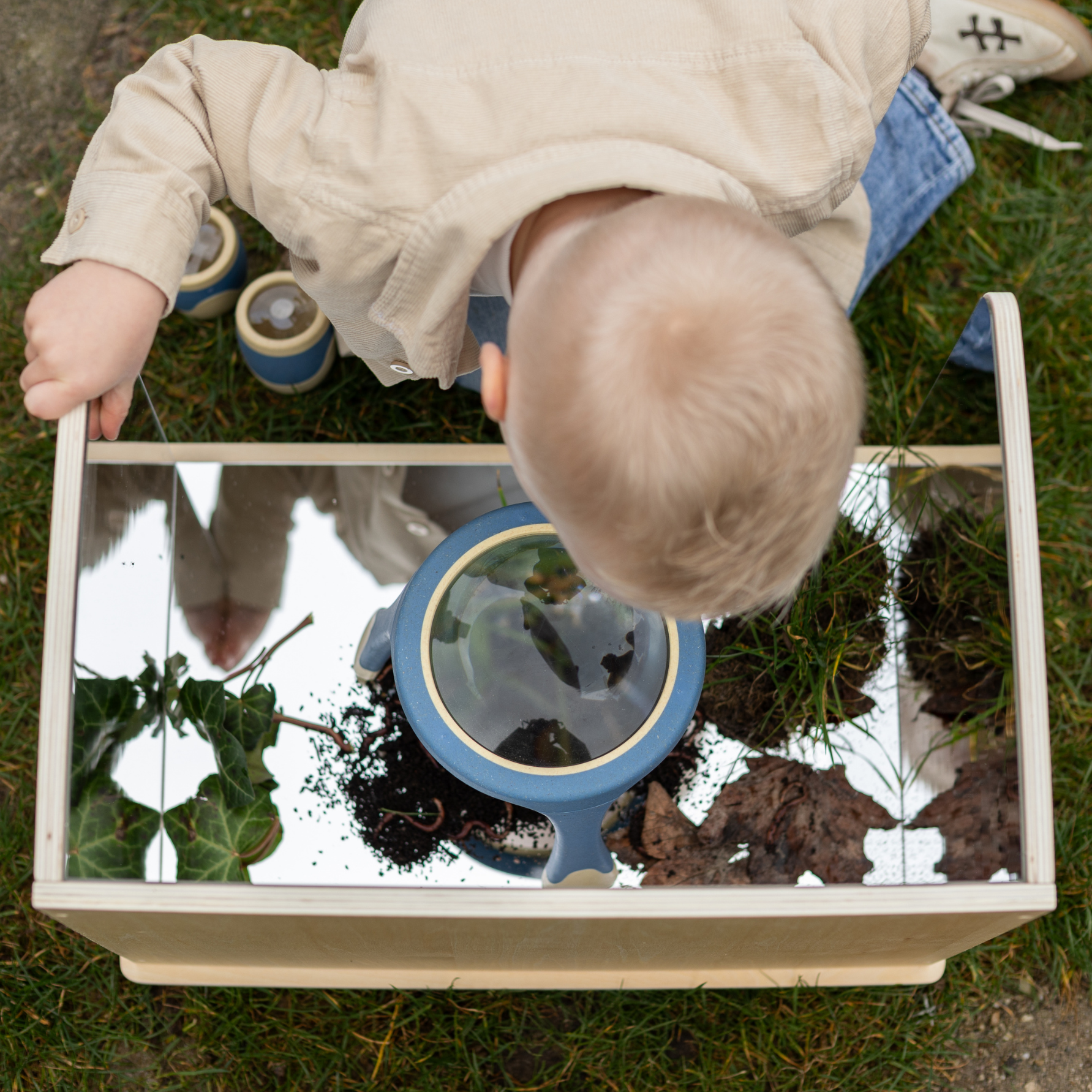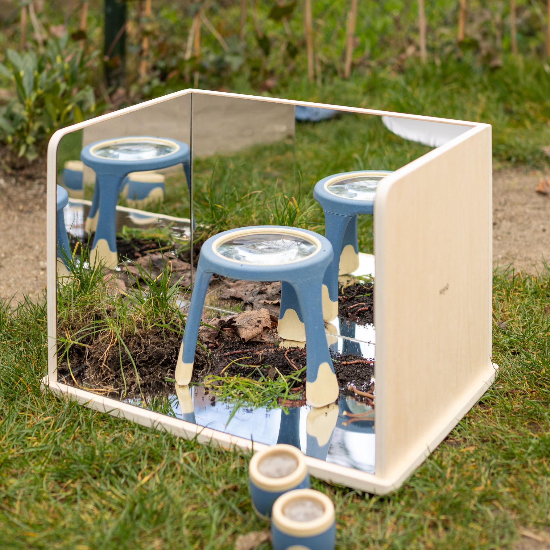 Een massief beukenhouten box met 3 zijdes spiegel die zorgt voor een veilige ruimte om te kunnen experimenteren met de reflectie. Kinderen kunnen op de houten spiegelbox verschillende materialen gebruiken zoals de loose parts materialen van Grapat, de transparanten materialen van TickiT en het Kinetisch zand. Ook is de spiegelbox leuk voor het ontdekken van natuurlijke materialen zoals bijvoorbeeld insecten, bladeren ect.