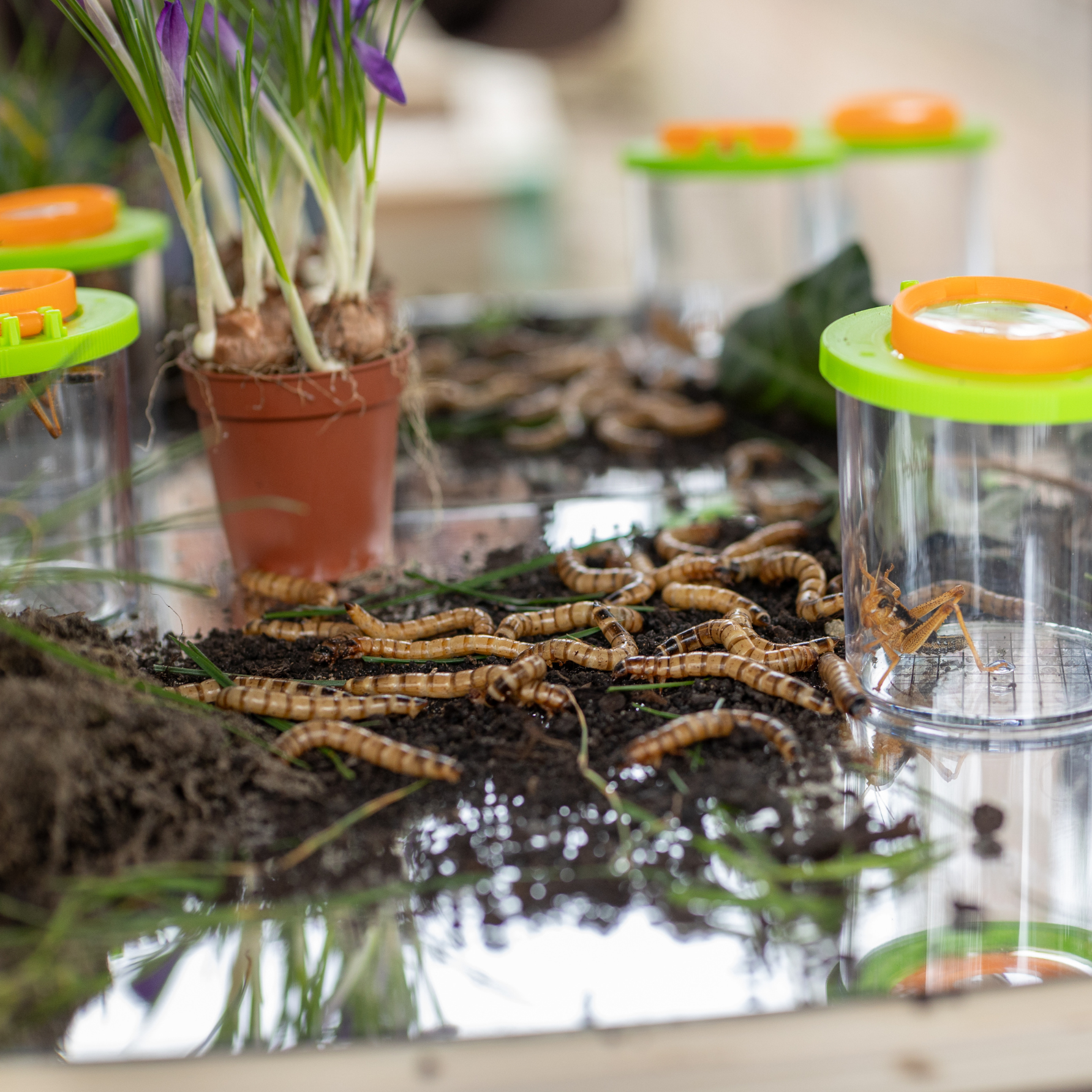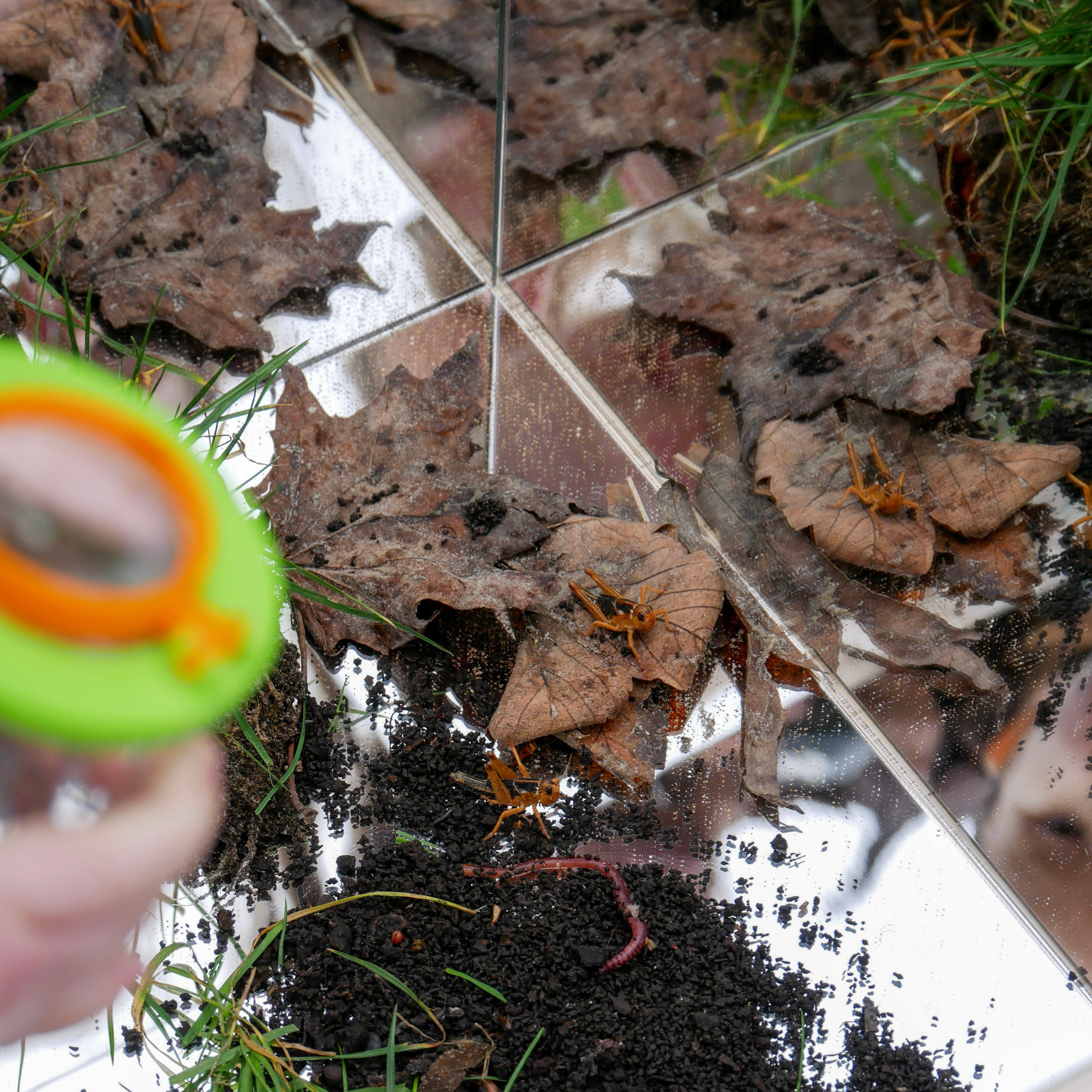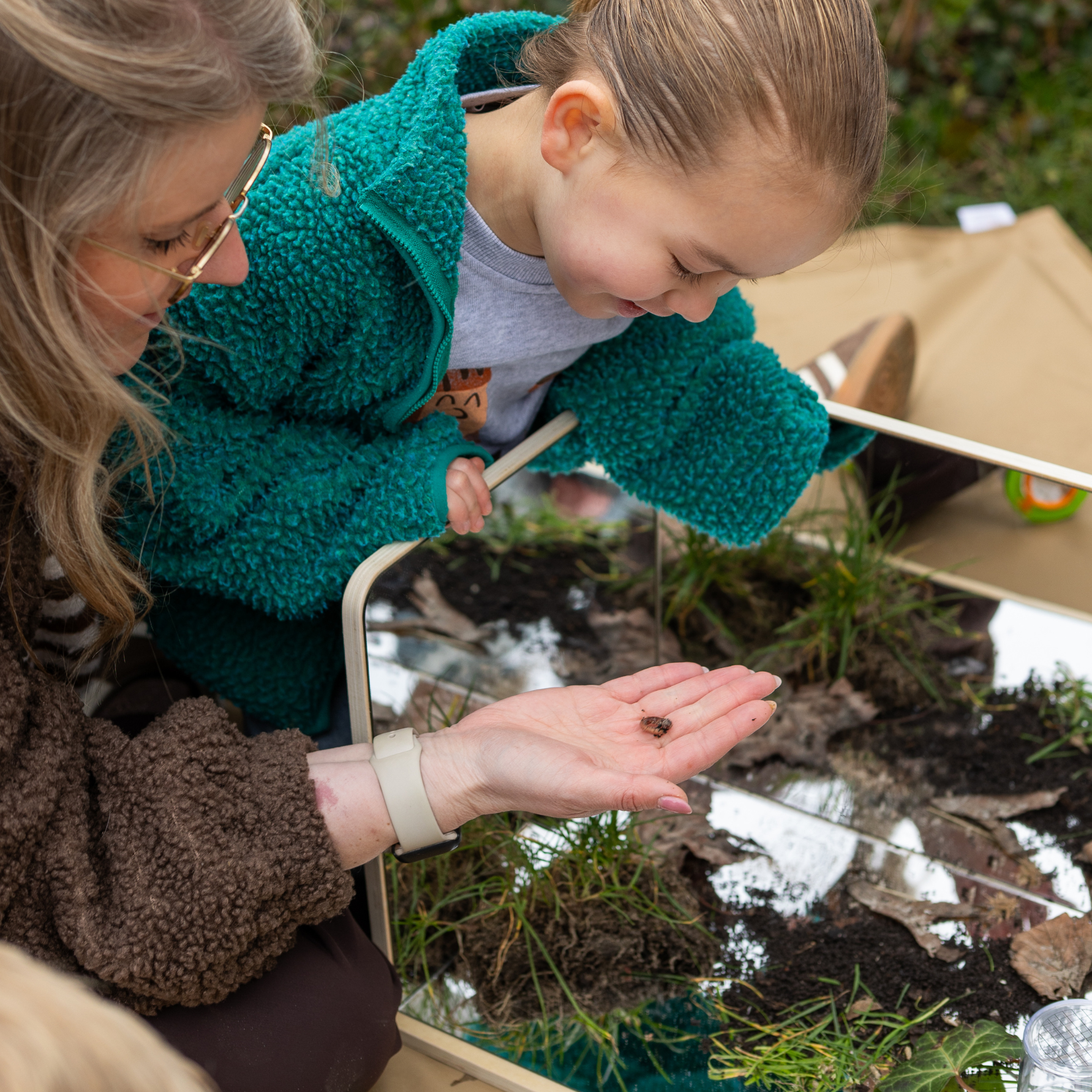 Een massief beukenhouten box met 3 zijdes spiegel die zorgt voor een veilige ruimte om te kunnen experimenteren met de reflectie. Kinderen kunnen op de houten spiegelbox verschillende materialen gebruiken zoals de loose parts materialen van Grapat, de transparanten materialen van TickiT en het Kinetisch zand. Ook is de spiegelbox leuk voor het ontdekken van natuurlijke materialen zoals bijvoorbeeld insecten, bladeren ect.
