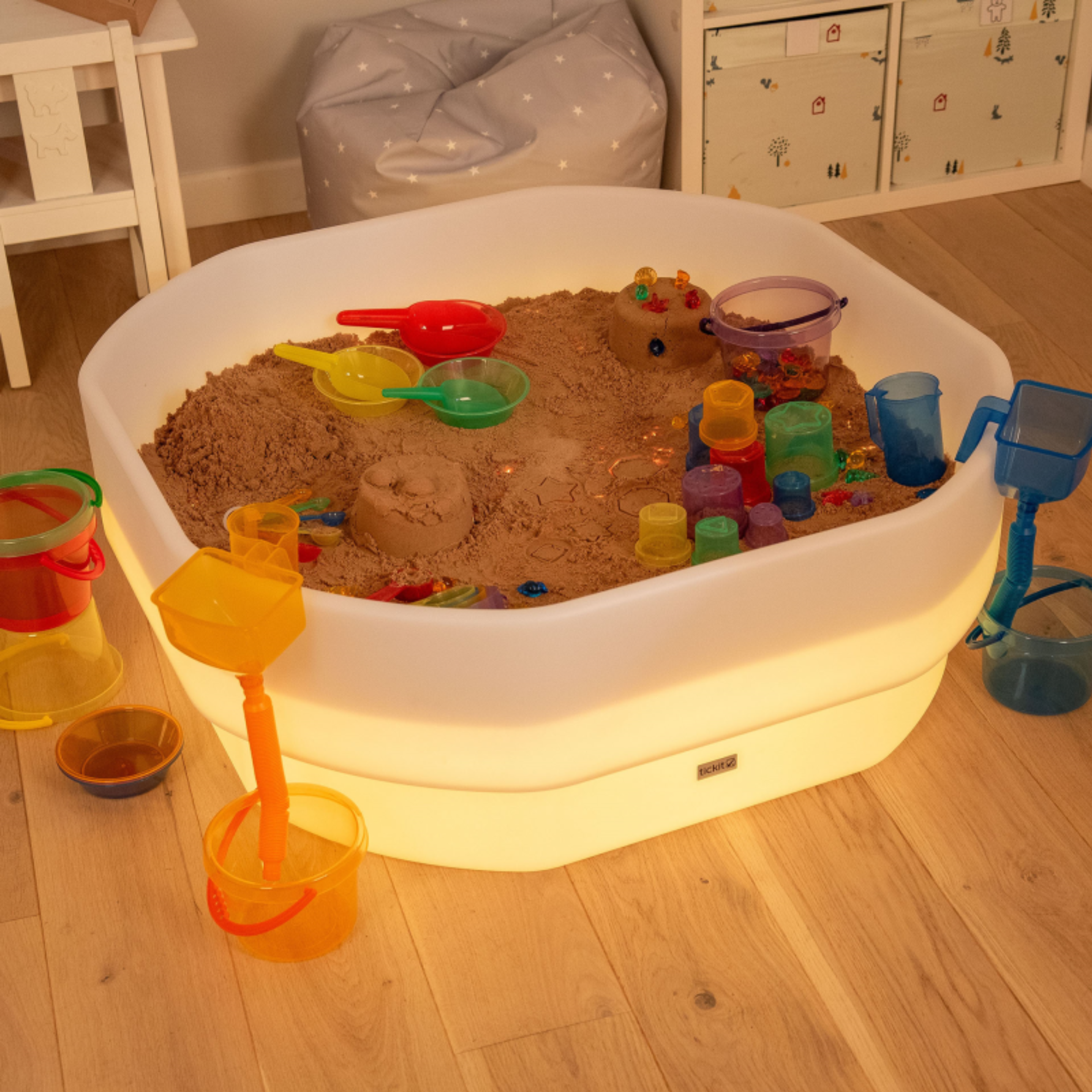 De lichttafel biedt eindeloze mogelijkheden voor leren door doen en probleemoplossend denken. Je kunt de tafel gebruiken met water, Kinetic Sand maar ook met andere sensorische materialen zoals (gekleurde) rijst of kikkererwten.
