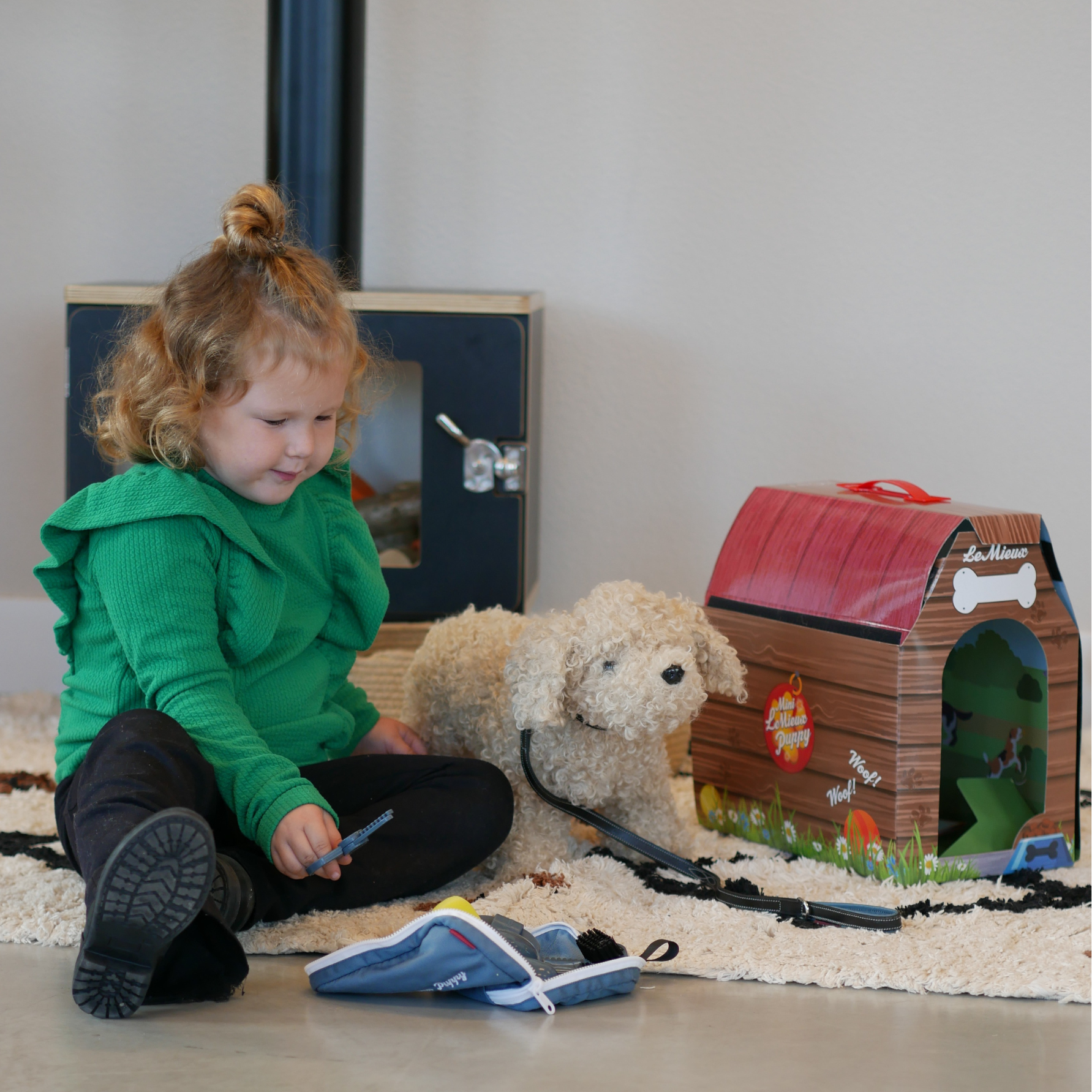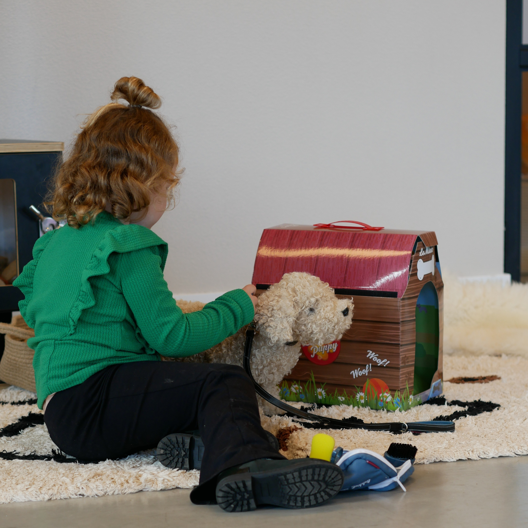 Chester is een schattige crème vrijstaande pup met realistisch bont. Deze pup wordt geleverd met een eigen omkeerbare kartonnen kennel die binnenstebuiten een hondenpark blijkt te worden!