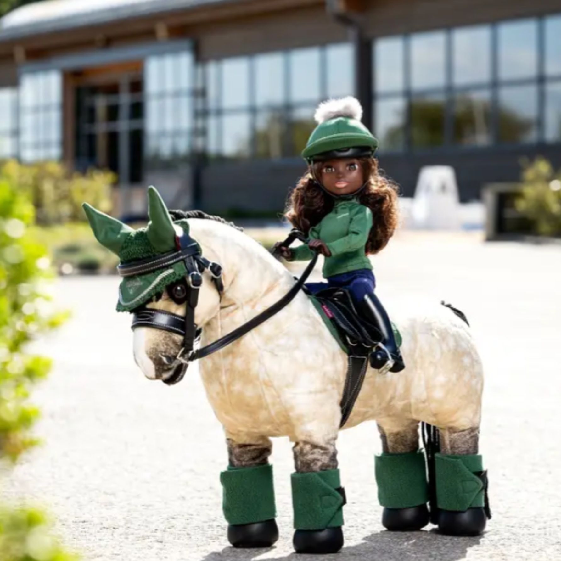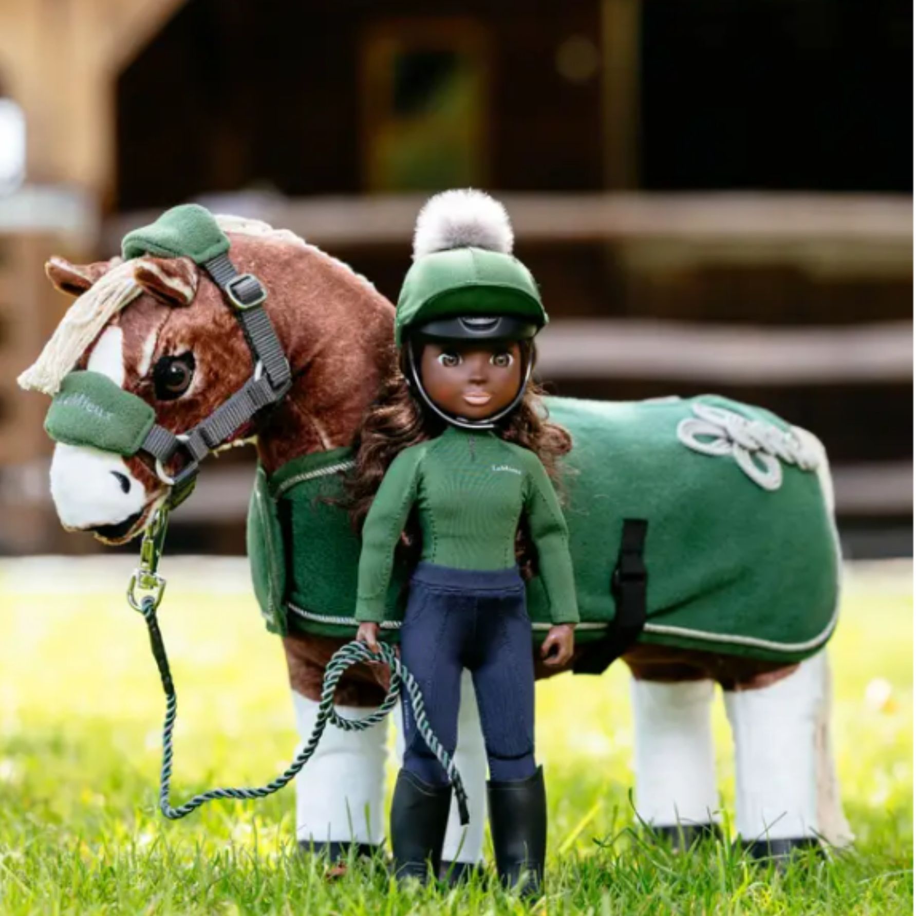 Rider Maya is een van de drie interactieve volledig beweegbare, hoogwaardige speelgoedruiters met een unieke uitstraling en bijpassende outfit in een van de LeMieux-kernkleuren. Ze heeft prachtig, echt aanvoelend lang donker haar dat je kunt borstelen en ook natuurlijke wimpers. Ze draagt een set afneembare replica LeMieux-rijkleding in Hunter Green, inclusief een afneembare cap en laarzen.