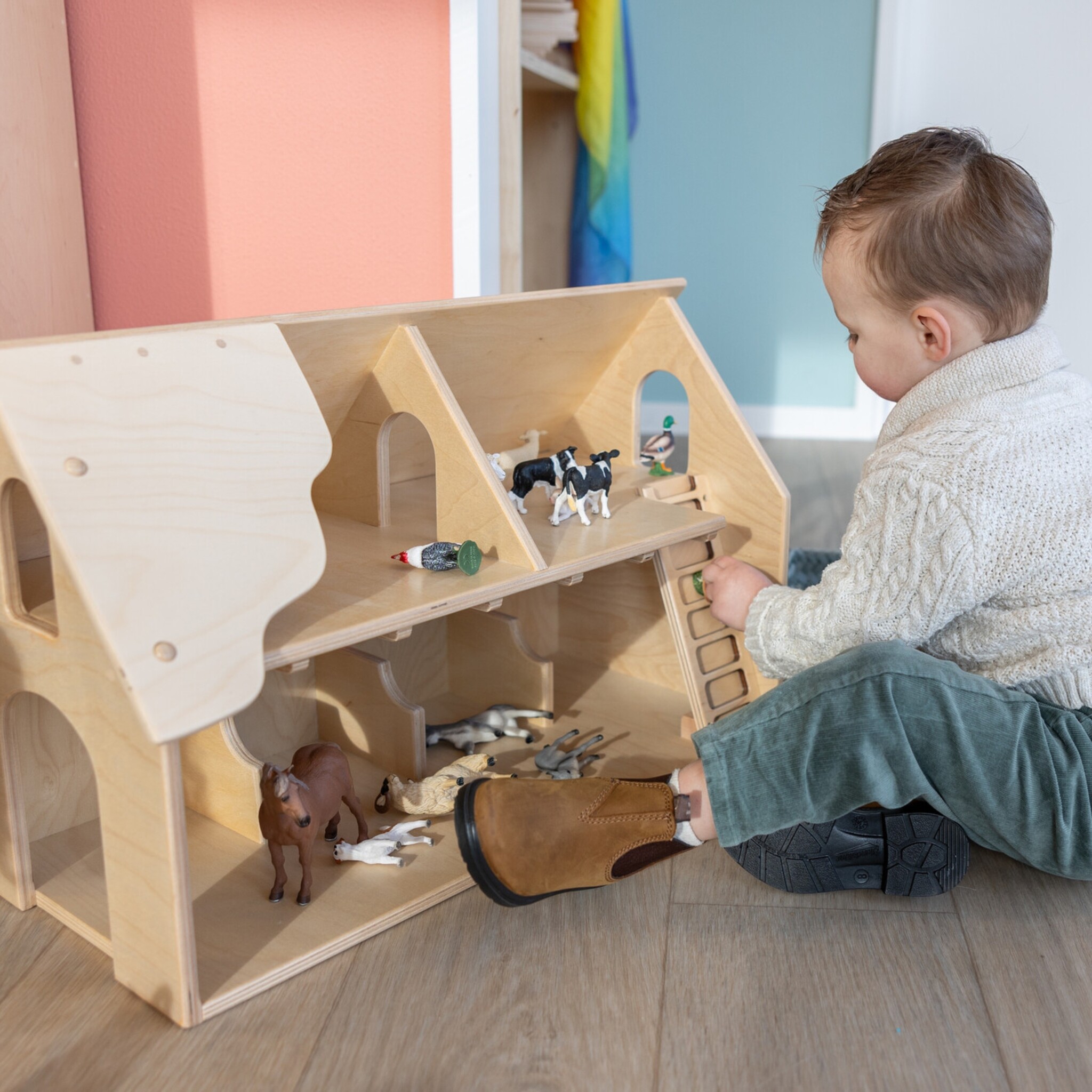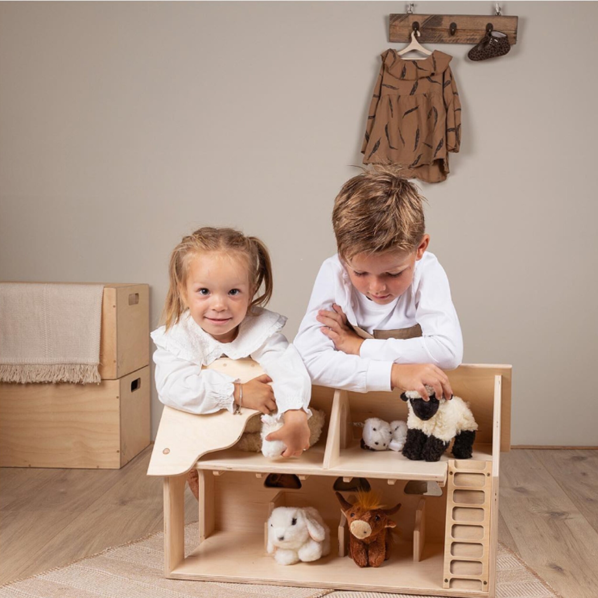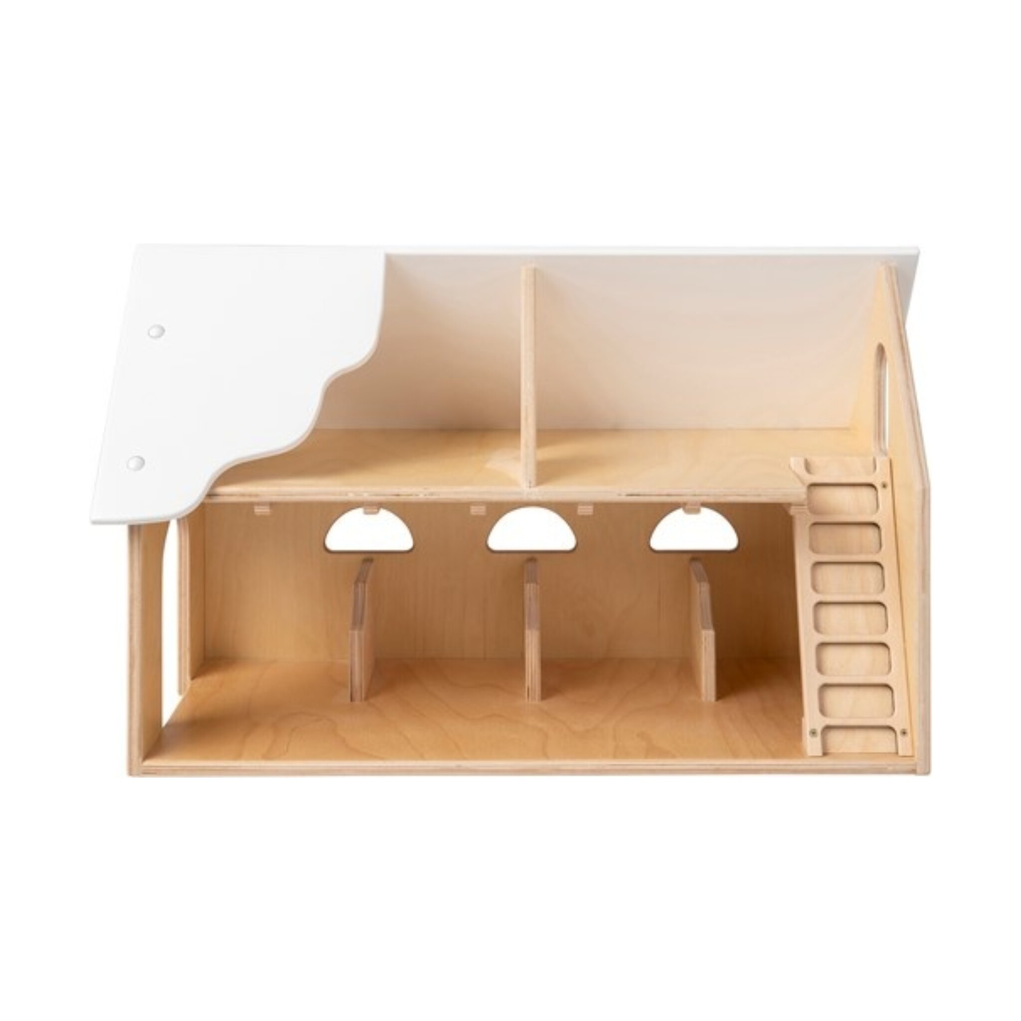 Naturel houten boerderij met wit dak van Van Dijk Toys. De boerderij heeft twee verdiepingen, zodat er plek is voor heel veel dieren. De boerderij is aan de voorkant geheel open en aan de zijkanten zijn openingen zodat er meerdere kinderen mee kunnen spelen. Ideaal voor scholen, de kinderopvang of gastouderopvang.