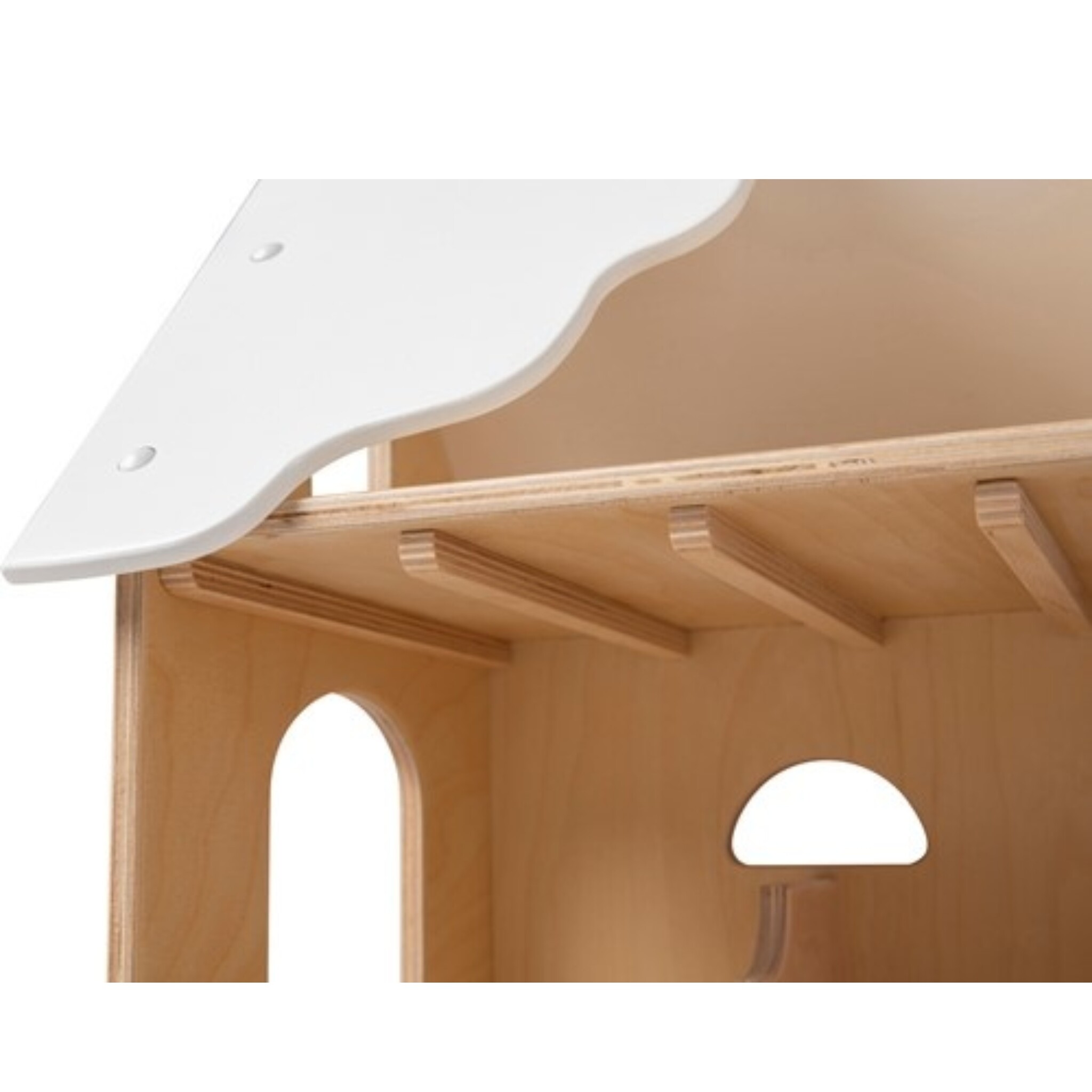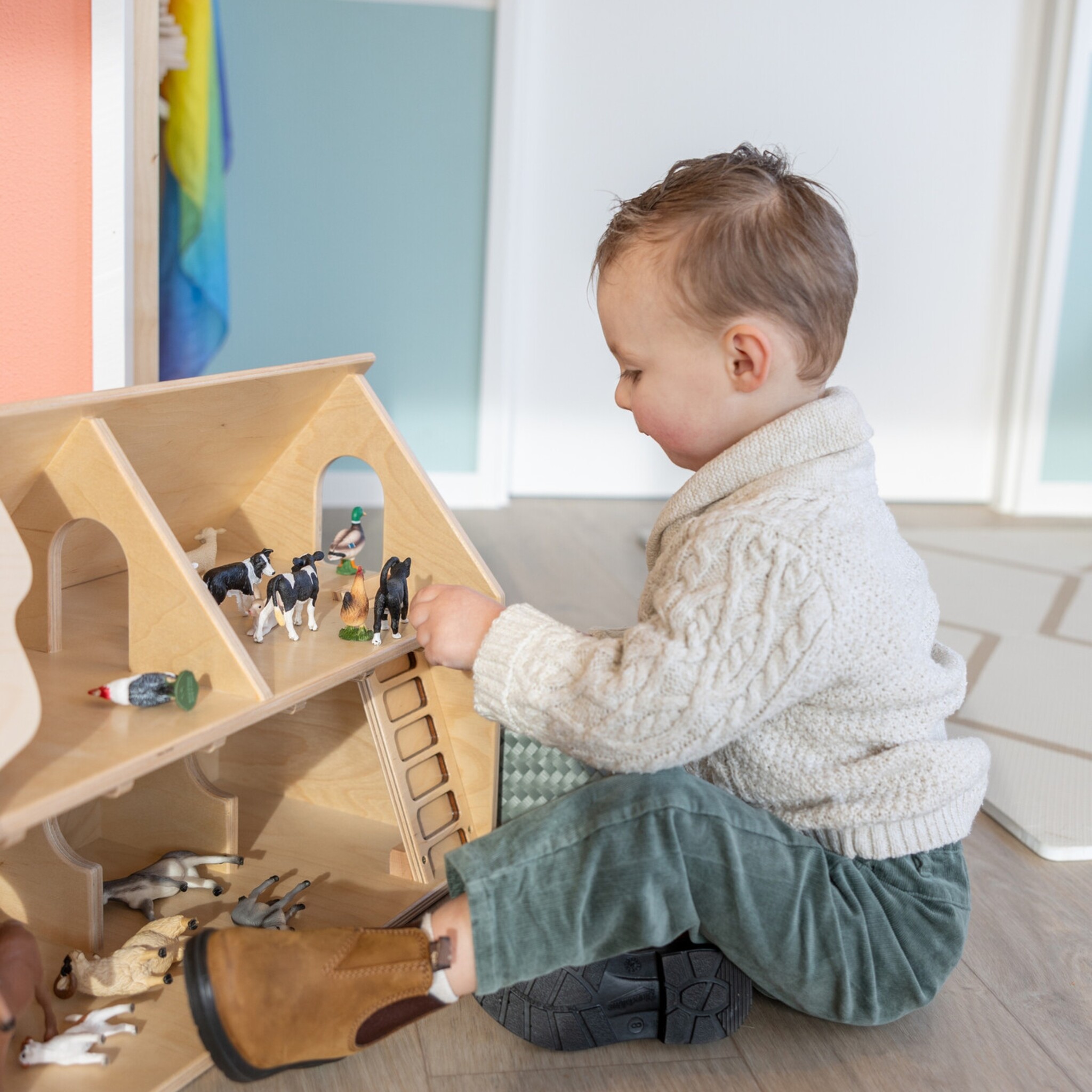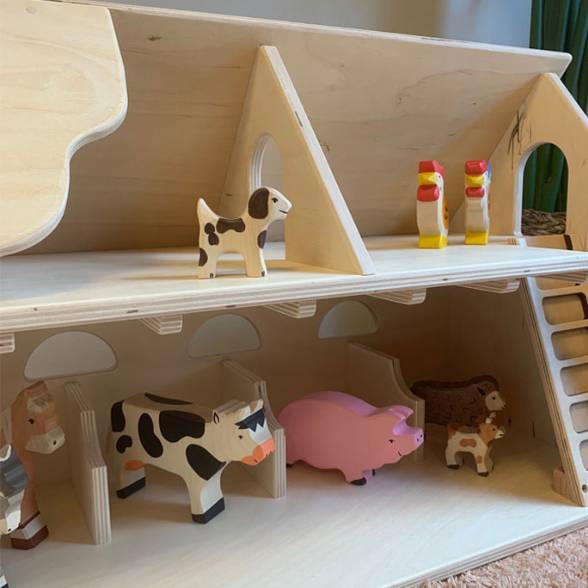 Naturel houten boerderij met wit dak van Van Dijk Toys. De boerderij heeft twee verdiepingen, zodat er plek is voor heel veel dieren. De boerderij is aan de voorkant geheel open en aan de zijkanten zijn openingen zodat er meerdere kinderen mee kunnen spelen. Ideaal voor scholen, de kinderopvang of gastouderopvang.