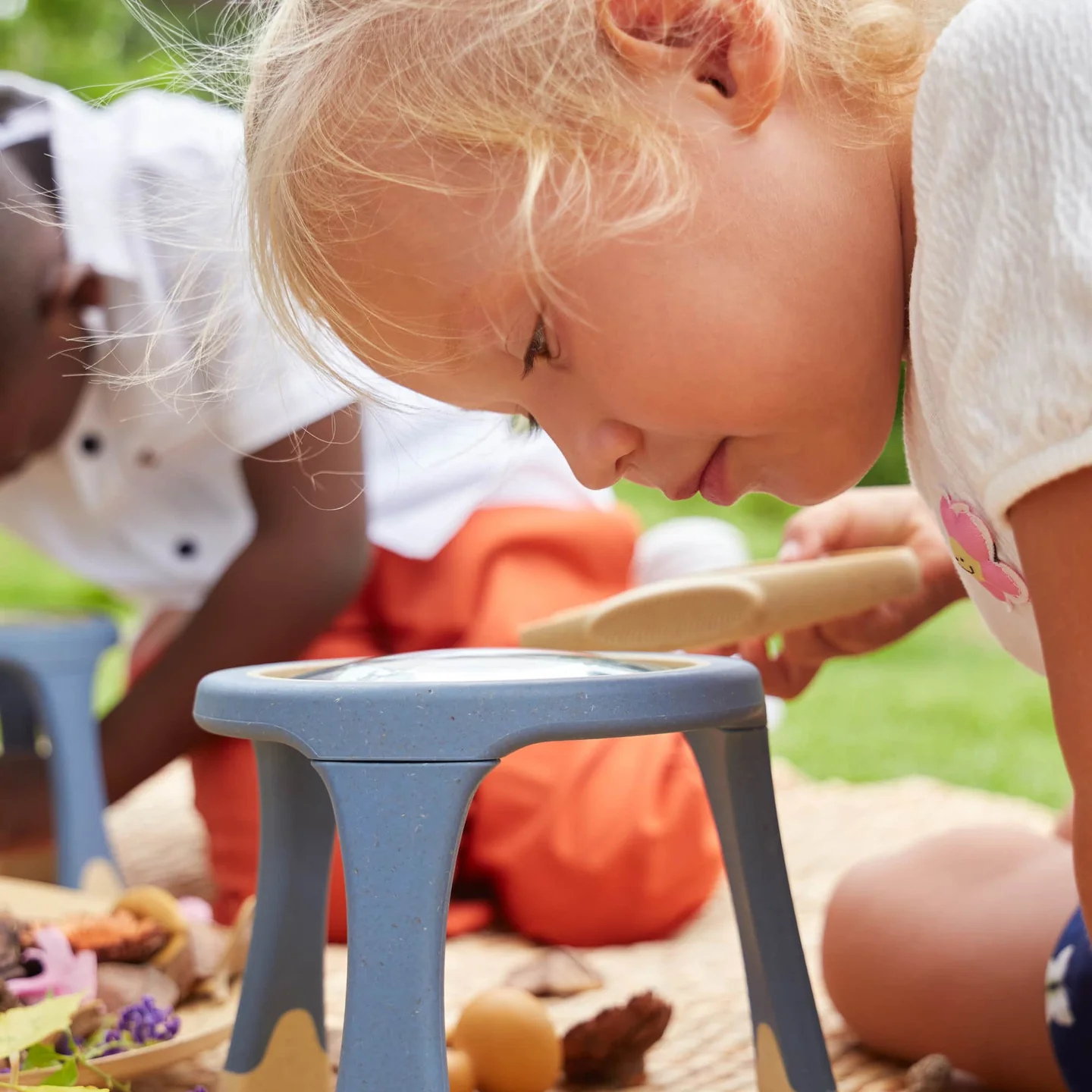 De vergrootglaslens vergroot objecten vijf keer, waardoor kinderen details van bladeren, insecten, texturen en andere kleine vondsten duidelijk kunnen zien en onderzoeken, wat hun nieuwsgierigheid prikkelt. Geschikt voor intensief gebruik binnen én buiten, en helpt het bij het ontwikkelen van observatievaardigheden en taal door natuurlijke ontdekkingservaringen.