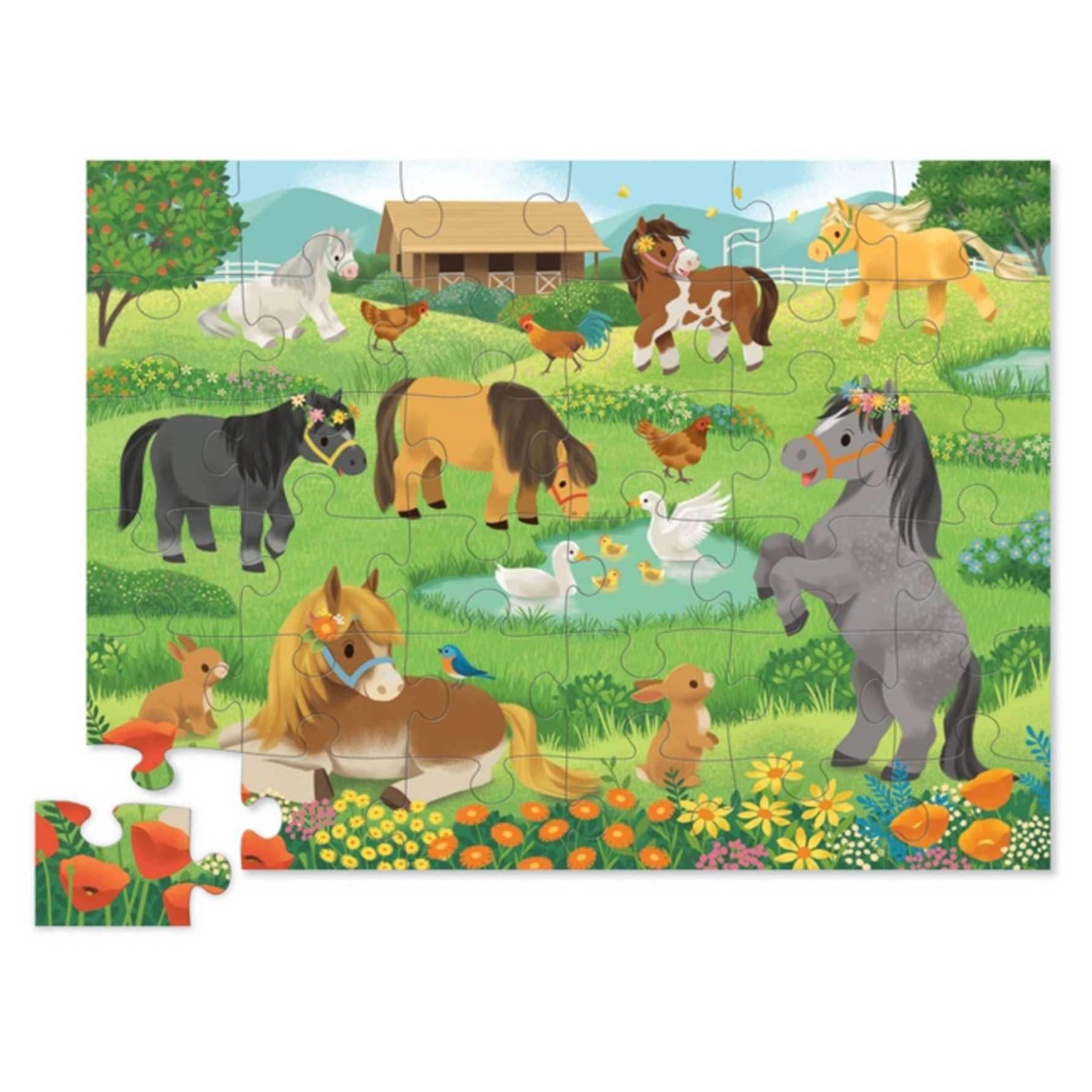 Mooie "Pretty Ponies" Vloerpuzzel met een kleurrijke afbeelding van een veld vol spelende pony's en hun vriendjes met prachtige kleuren. De puzzel bestaat uit 36 stevige jumbo puzzelstukken van hoge kwaliteit. De verpakking is compact en ruimtebesparend, geleverd in een prachtige, stevige geschenkdoos met silhouet. Puzzelen stimuleert zelfstandig denken en oplossen, vergroot de ruimtelijke vaardigheden en helpt de fijne motoriek te verbeteren.