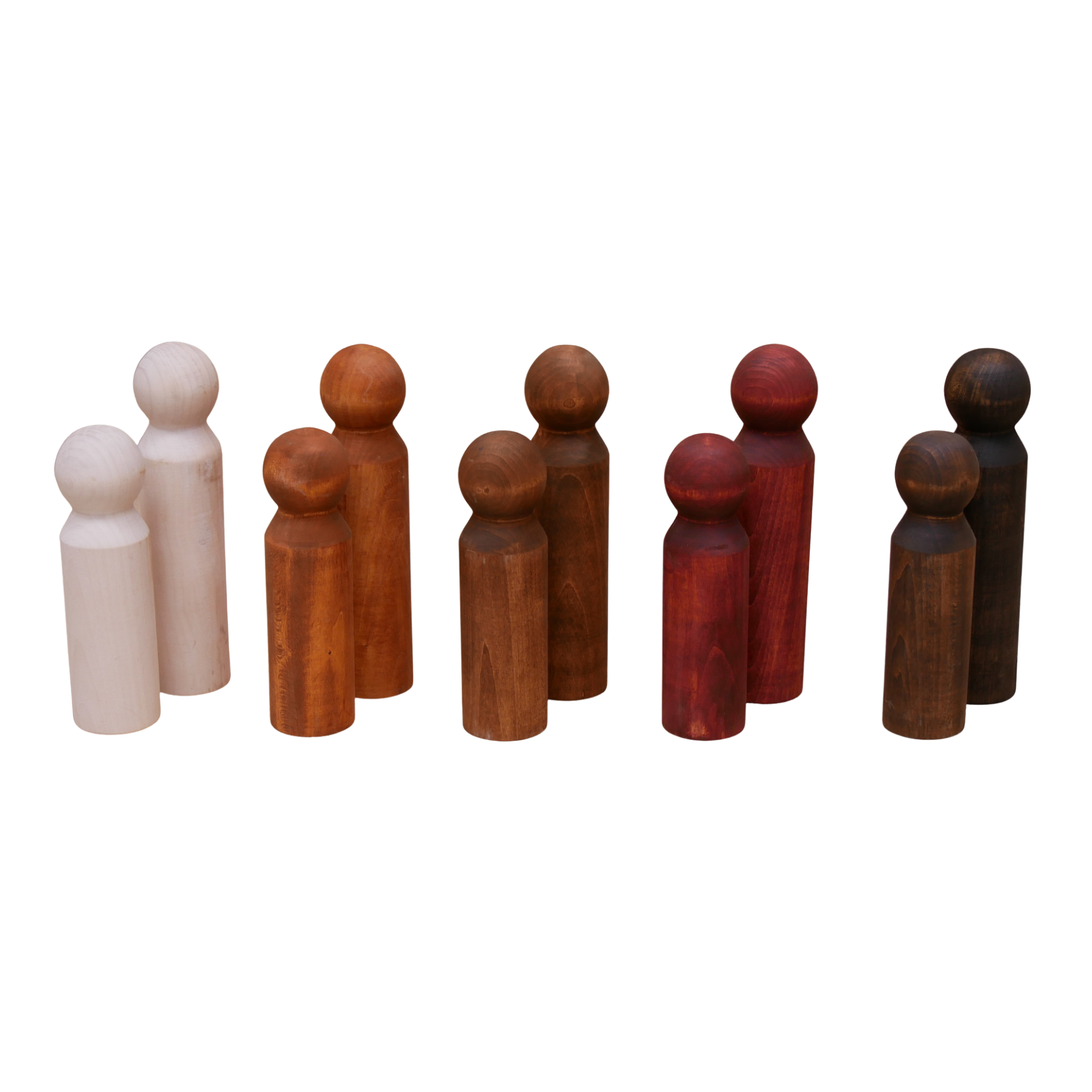 Een prachtige set houten poppen waarbij diversiteit centraal staat. De poppen zijn gemaakt van hout in verschillende groottes en huidtinten, wat uitnodigt tot open spel en een spel in een kleine wereldomgeving. De poppen zijn geschikt voor zowel binnen als buiten, voor nog meer speelplezier!